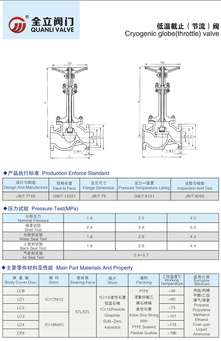 低溫截止閥的閥桿軸線與閥座密封面垂直。閥桿開啟或關閉行程相對較短,并具有非常可靠的切斷動作,使得這種閥門非常適合作為介質的切斷或調節及節流使用。
