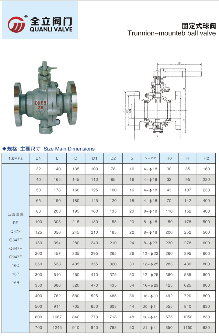 固定球閥有二塊式和三塊式兩種閥體結構,中法蘭用螺栓連接,密封采用增強聚四氟乙烯鑲入不銹鋼圈內,鋼圈后部設有彈簧保證閥座緊貼球體,保持密封。上下閥桿均設有PTFE軸承,減少磨擦,操作省力,小軸底部設有調整片,保證球與密封圈的接處位置。全通徑:閥門流量孔徑與管線內徑一致,以便管線清掃。