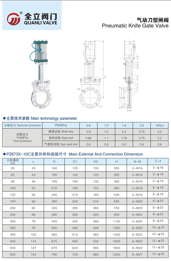 The pneumatic knife type gate valve has the advantages of simple and compact structure, reasonable design, light section material, reliable sealing, light and flexible operation, small volume, smooth channel, small flow resistance, light weight, easy installation and easy dismantling, etc., working pressure 1.0MPa -2.5MPa, the use of temperature -29-650 ℃ under normal circumstances. The knife-type gate valve with a shear function, can be scraped on the sealing surface of the adhesive material, automatic removal of debris, stainless steel gate to prevent corrosion caused by leakage of the seal.