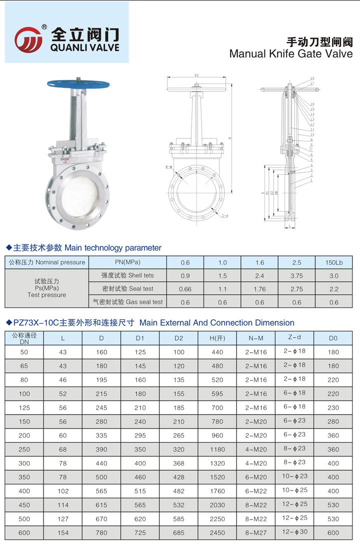 Knife blade gate valve Product Notes and features: knife-type gate valve is the gate opening and closing pieces of the gate, the direction of movement of the gate and the direction perpendicular to the fluid, the knife-type Gate valve can only be fully open and fully closed, can not be adjusted and throttling. Gate has two sealing surface, the most commonly used mode gate valve sealing surface of the formation of two wedge-shaped wedge angle varies with the valve parameters, usually 50, wedge-type knife gate valve can be made into a whole, called the Rigid gate; can also be made to produce micro-deformation of the gate to improve its technology, to make up the sealing surface angle deviation in the processing process, this gate is called flexible gate knife gate valve closed, the sealing surface Can rely on the medium pressure to seal, that is, relying on the media pressure to the gate of the sealing surface to the other side of the valve seat to ensure the sealing surface of the seal, which is self-sealing.Most of the knife gate valve is forced seal, Valve closed, to rely on external force to force the gate pressure to the valve seat to ensure the sealing surface of the seal.