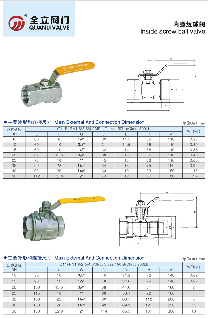 Third, Q11F three-piece internal thread ball valve standard specifications: